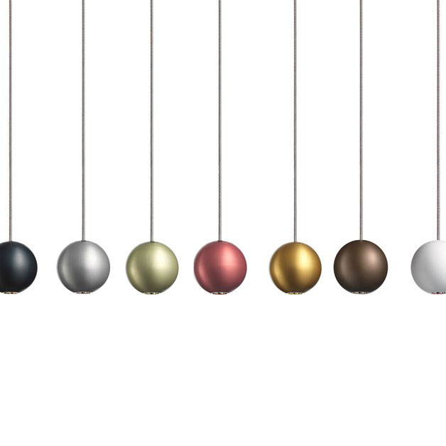 DOT 28 ORB ist in ihrer Form eine minimalistische Hängeleuchten-Kugel. Hochwertig gefertigt aus eloxiertem Aluminium, hängt sie an einem dünnen Geflechtkabel.