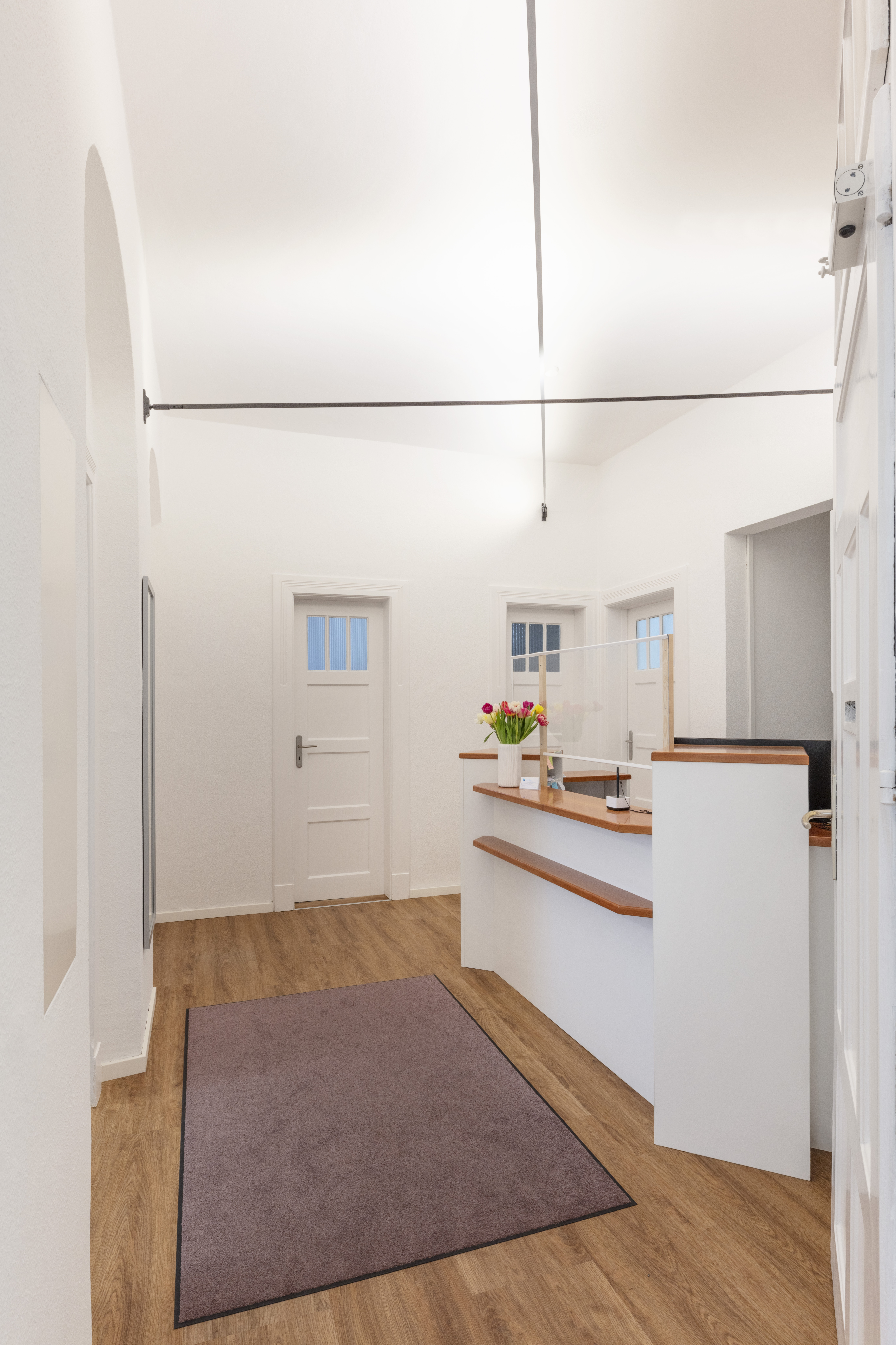 In den schönen Altbau Räumlichkeiten eines Münchner Allgemein Arztes konnte durch die vorhandene Deckenhöhe die Skyline Beleuchtung im Empfang perfekt in Szene gesetzt werden.