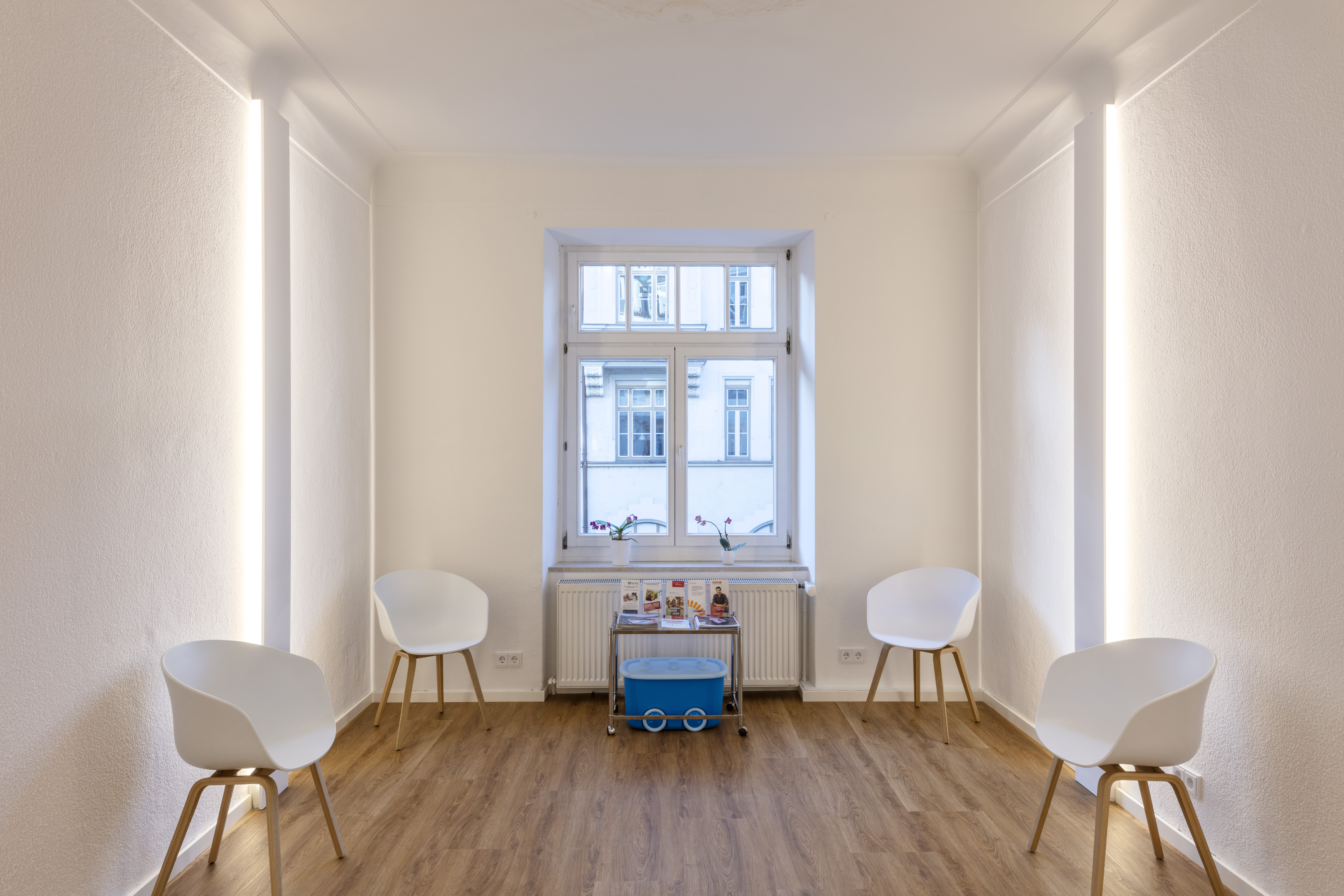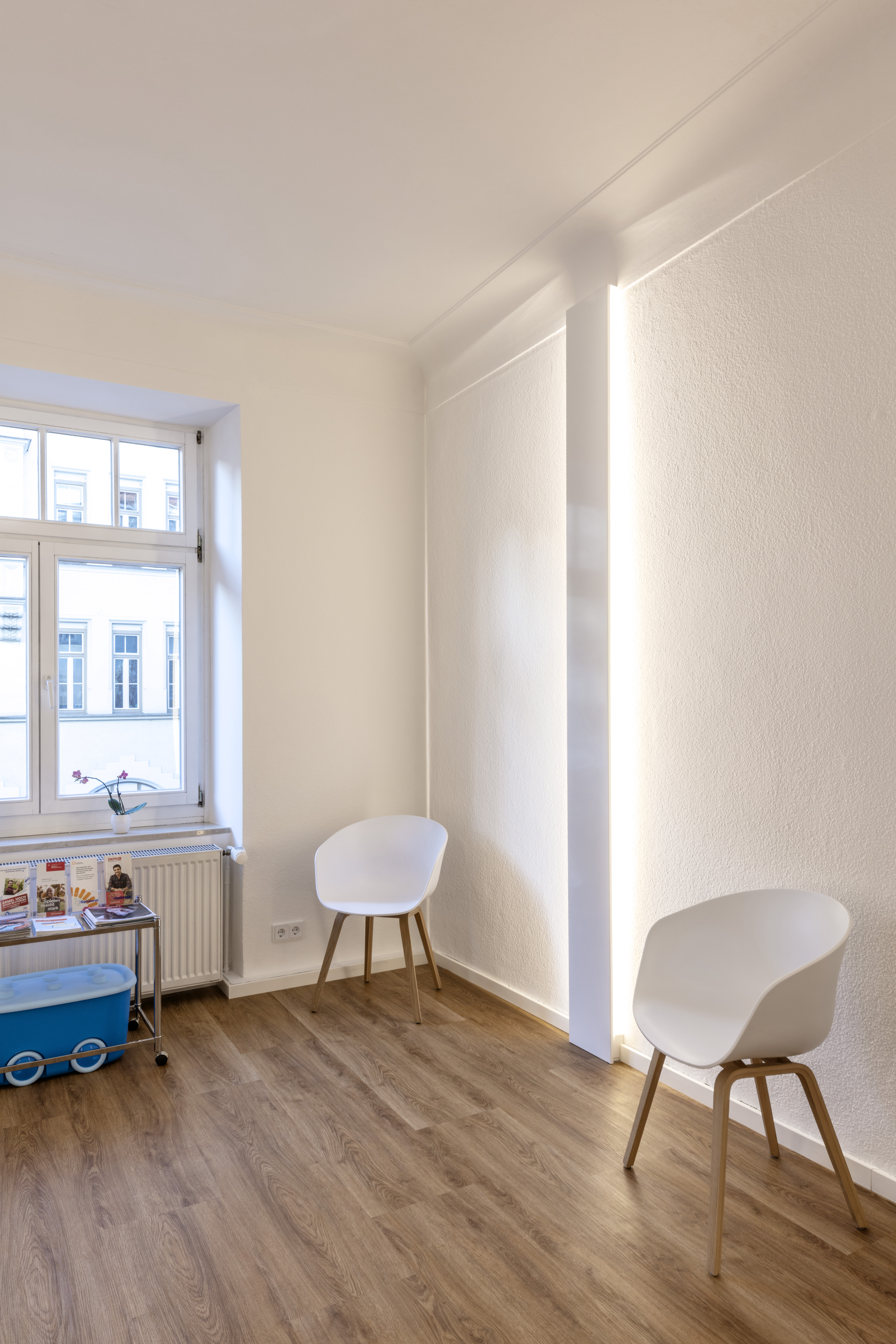 Der Wartebereich der Praxis Ist im minimalistischen Stil gehalten und wurde durch eigens konstruierte Wand Aufbauelemente auf beiden Seiten mit indirekter Beleuchtung modern aufgewertet.