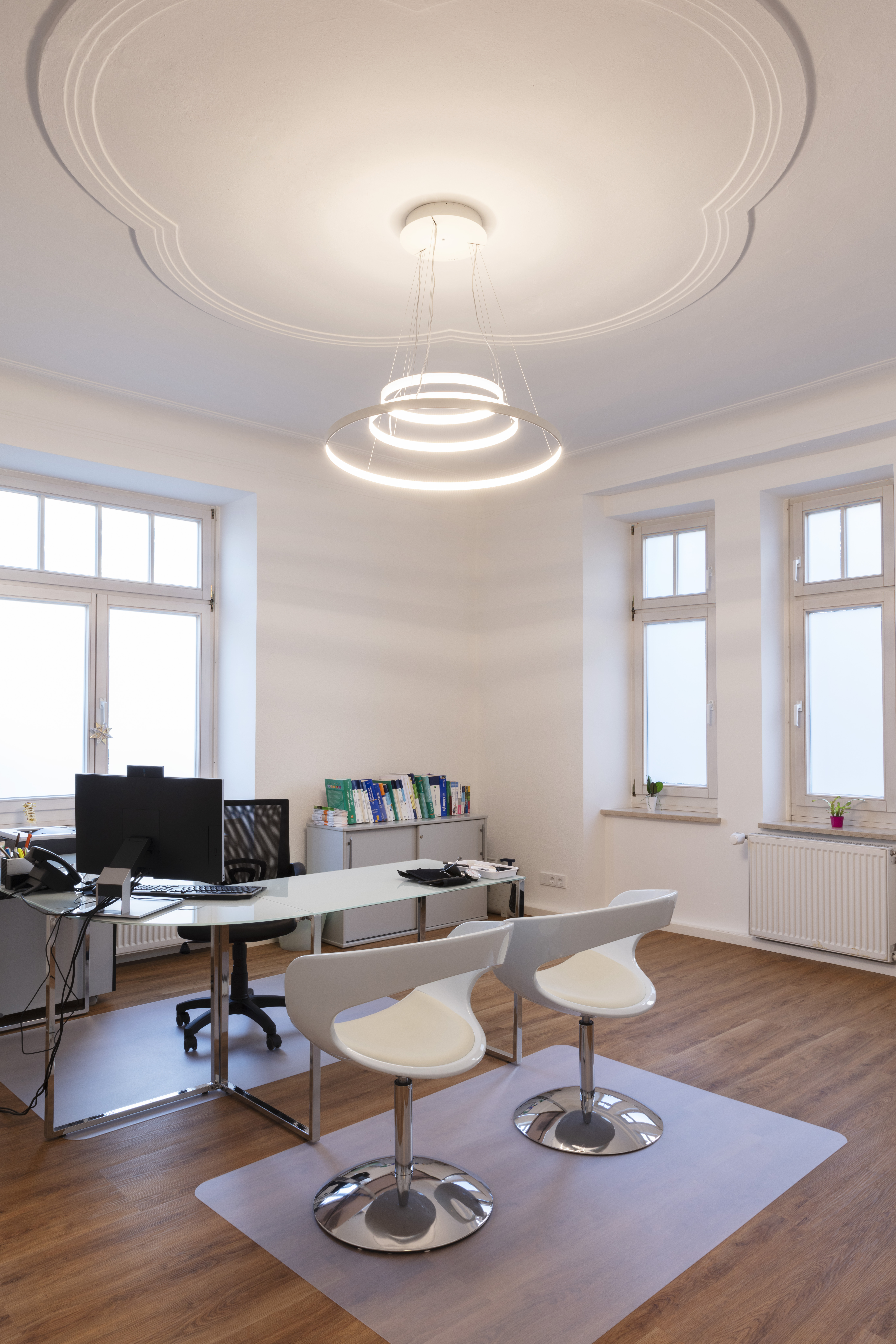 Im Behandlungsraum konnte die vorhandene Deckenrosette mit der modernen Pendelleuchte „Rings“ von ZavaLuce perfekt inszeniert und eine harmonische Komposition zwischen Altbau und futuristischem Design geschaffen werden.