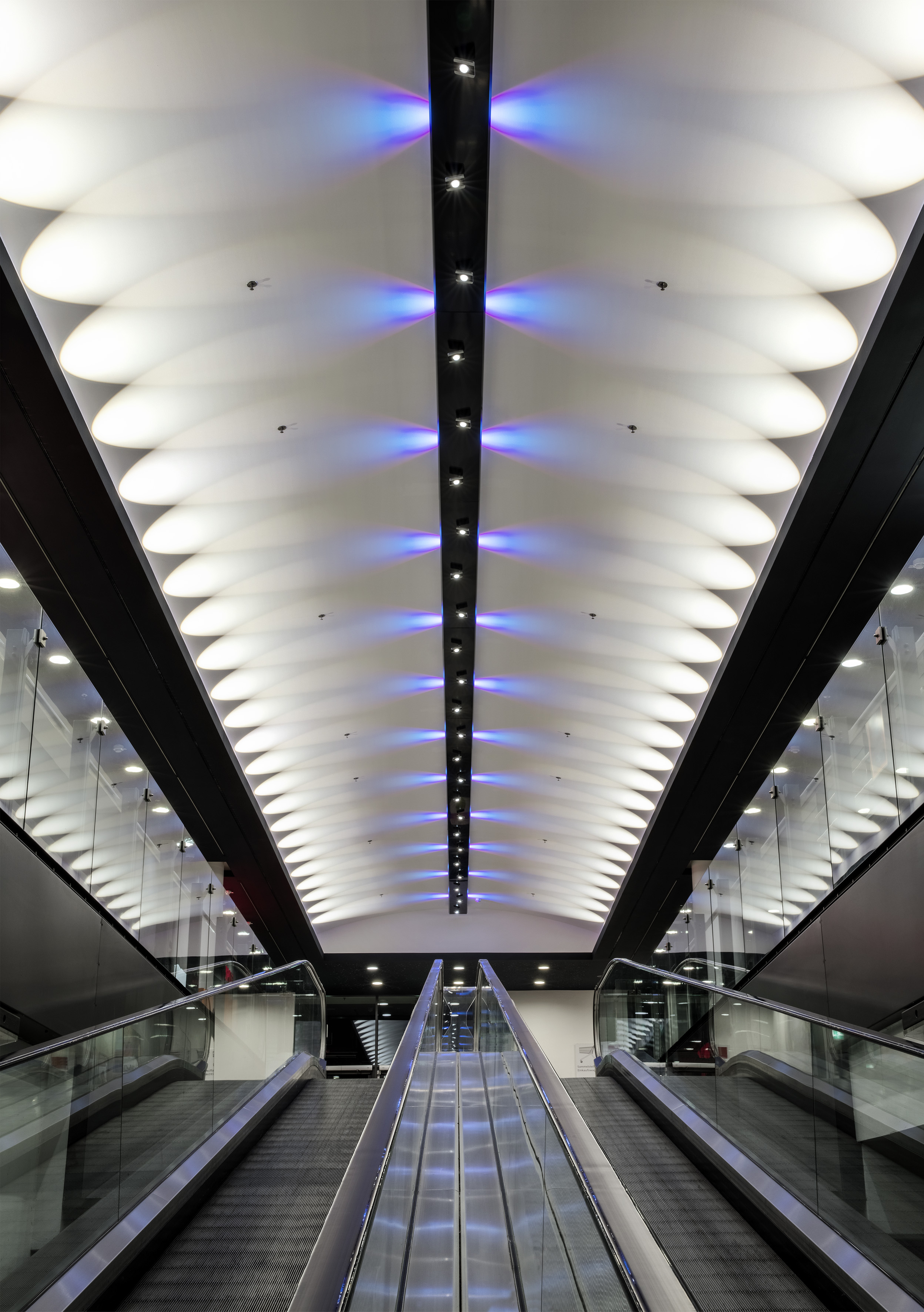 Die Linsenleuchten, die das indirekte Licht kegelförmig an die Decke strahlen, sind hinter einer 42 Meter langen, schwarz pulverbeschichteten, Aluminiumwanne integriert, als auch an den seitlichen Vouten angebracht. Weitere Leuchten dienen zur direkten Ausleuchtung der Passage.